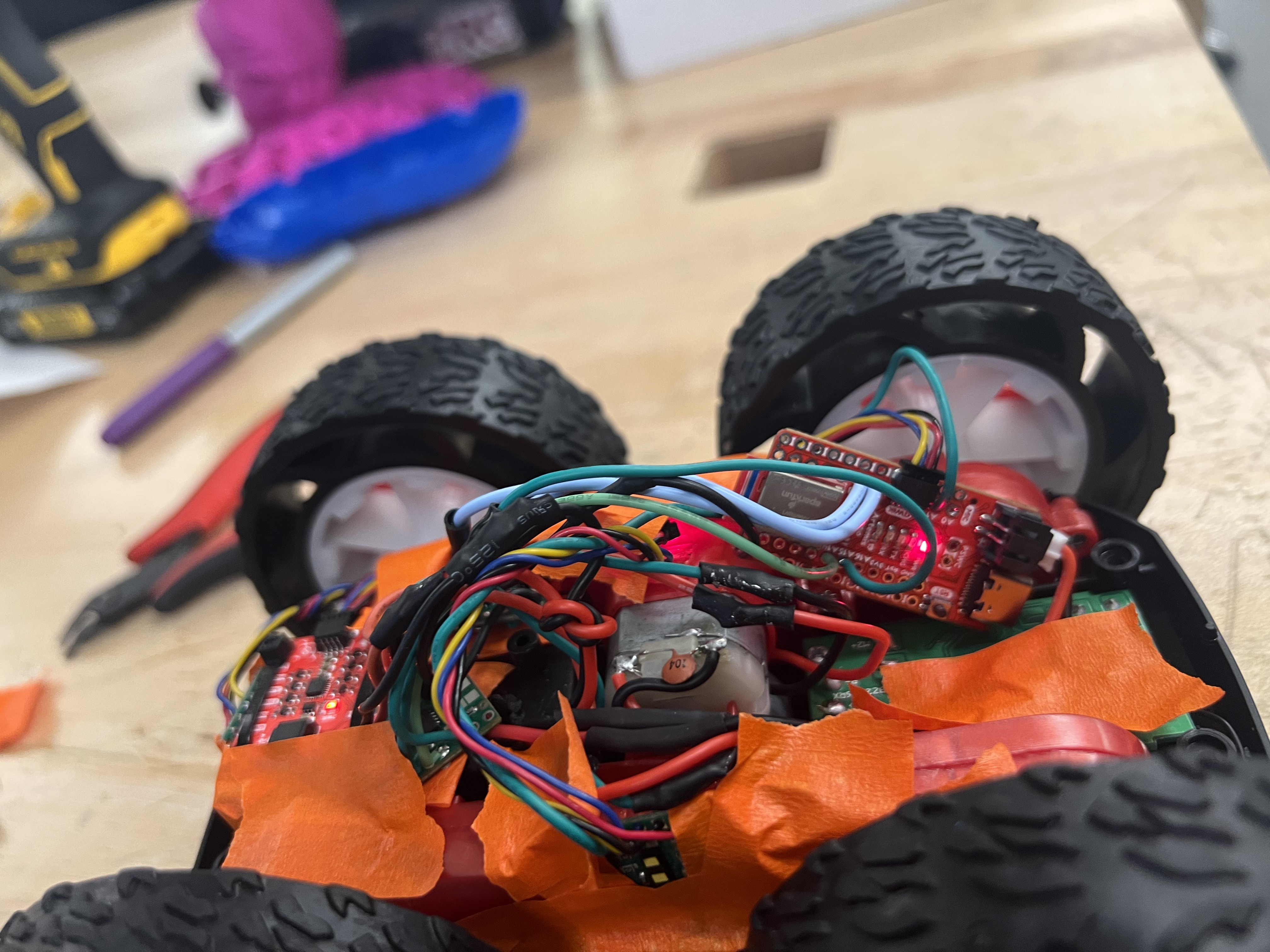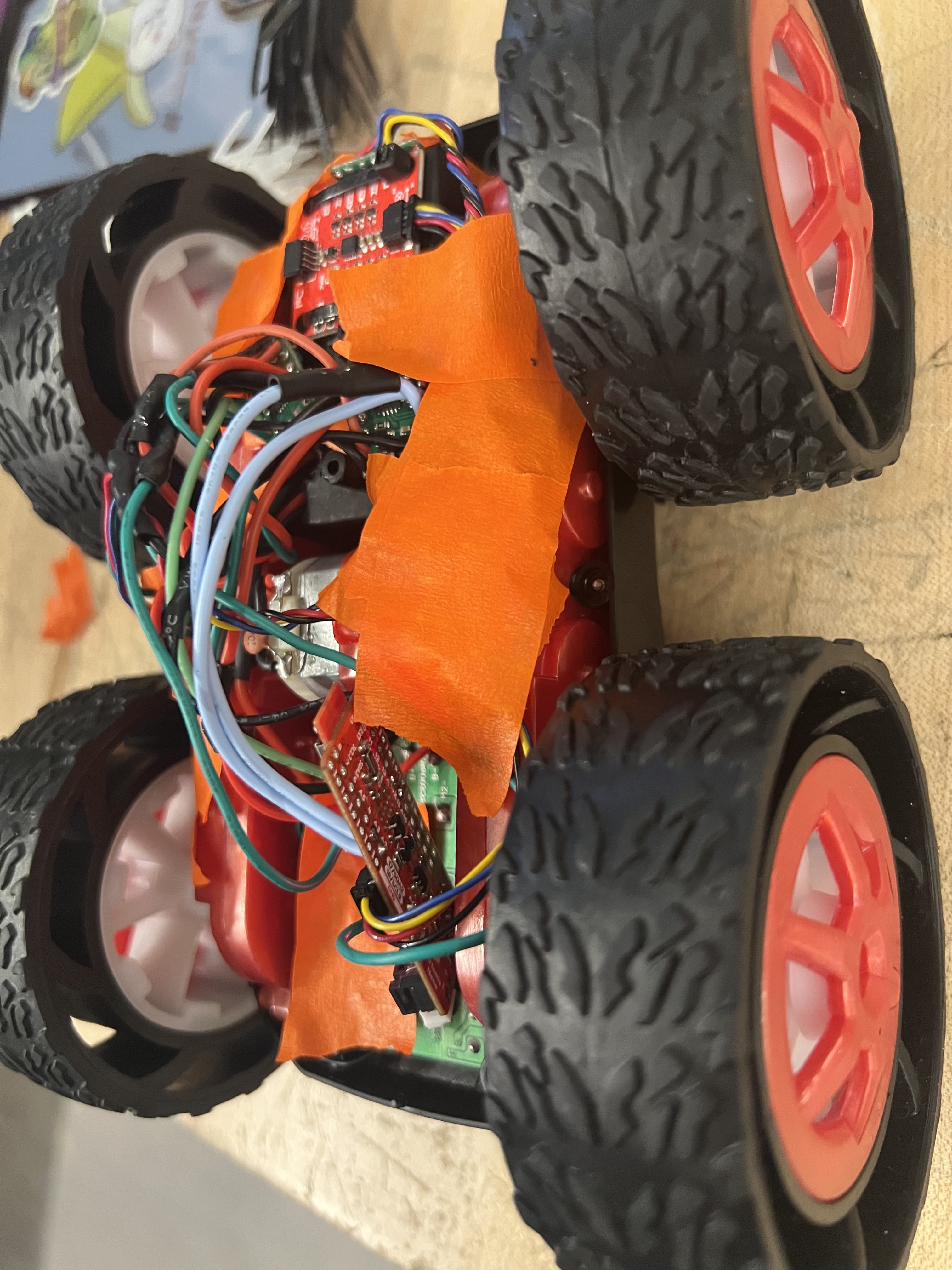 All components were packed securely into the chassis. The IMU were zip-tied in the front of the bot on the flat surface of the battery case. The motor drivers sits a bit back from there. I put both batteries in the battery case. The Artemis is mounted in the back of the car, and the two ToF sensors were placed in the front and the left side to ensure clear lines of sight. In this way, I try to keep all the high voltage component away from the sensors, try to keep the EMI as low as possible. I made sure no components stuck out past the wheels so the car could safely roll or flip without damaging the electronics. (Failed driving tests, ie. running into the wall, have shown, this is indeed reliable.)